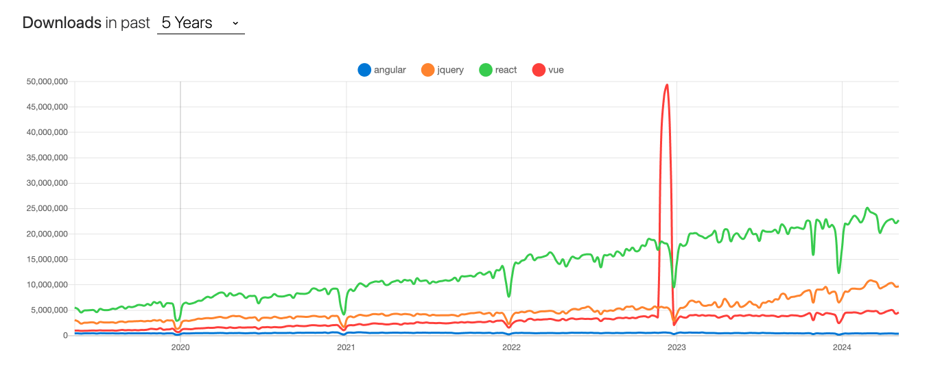 NPM Trends - https://npmtrends.com/angular-vs-jquery-vs-react-vs-vue